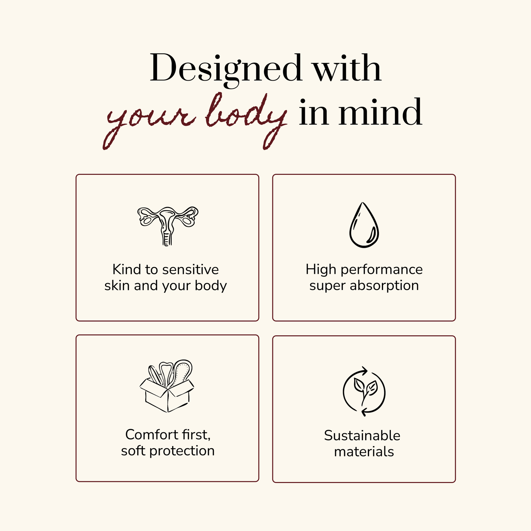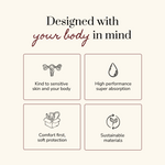Each pad is biodegradable, including the wrapper, and uses skin-safe adhesive that stays secure without relying on harsh glues. Like all of our packaging, the box is made from FSC-certified card, sourced from responsibly managed forests and fully recyclable.