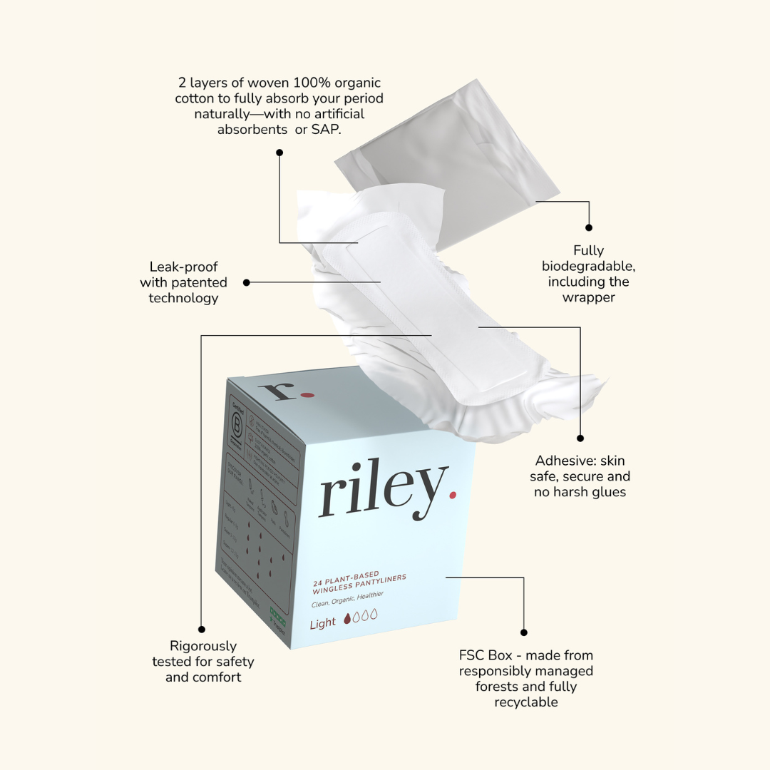 Our pantyliners are made with 100% GOTS certified organic cotton, free from harmful chemicals, fragrances, rayon, glues and plastics, unlike many mainstream brands. Riley pantyliners are designed to be kind to your body and our planet, offering reliable protection without compromising on comfort or sustainability.